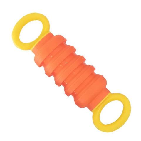 本发明公开了一种可压缩和伸展的玩具。该玩具具有多个交替的肋条和折叠部分。当玩具处于压缩状态时,折叠部分被折叠到玩具内部。当玩具处于伸展状态时,折叠部分被伸展到展开位置。该玩具的第一端设有手柄。该玩具的第二端也可以设有手柄。或者,该玩具的第二端设有吸盘。玩具的内部腔体可以完全封闭,或者在玩具的末端设有开口,或者在折叠部分或肋条上设有孔。
