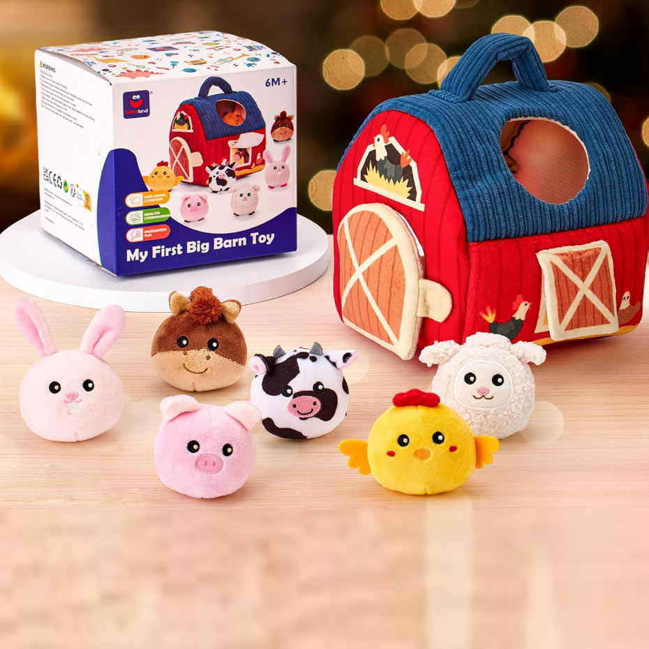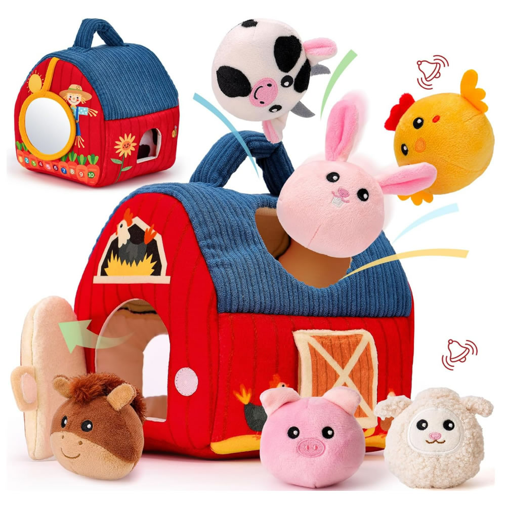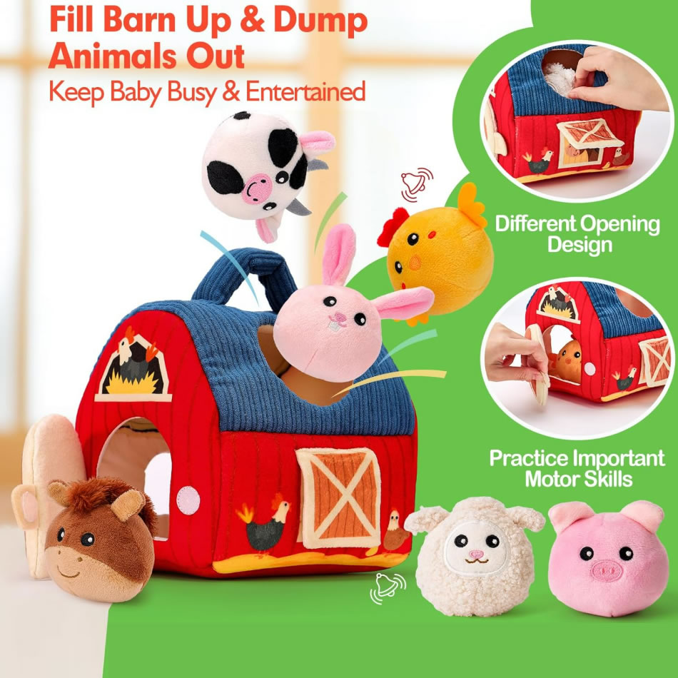 玩具套装包含一座可爱的农舍以及6种动物。牛棚设有两个特别设计的开口,让孩子能够将动物放入棚内,同时通过开口能够窥视里面的情况,而大门的设计便于轻松取出。这种互动式设计能吸引小朋友们的注意力,促进感官探索,并帮助他们发展精细动作技能,同时进行填充、倾倒和探索等活动。