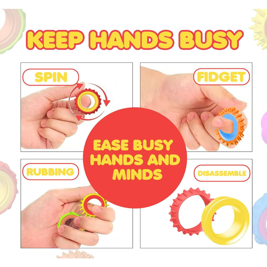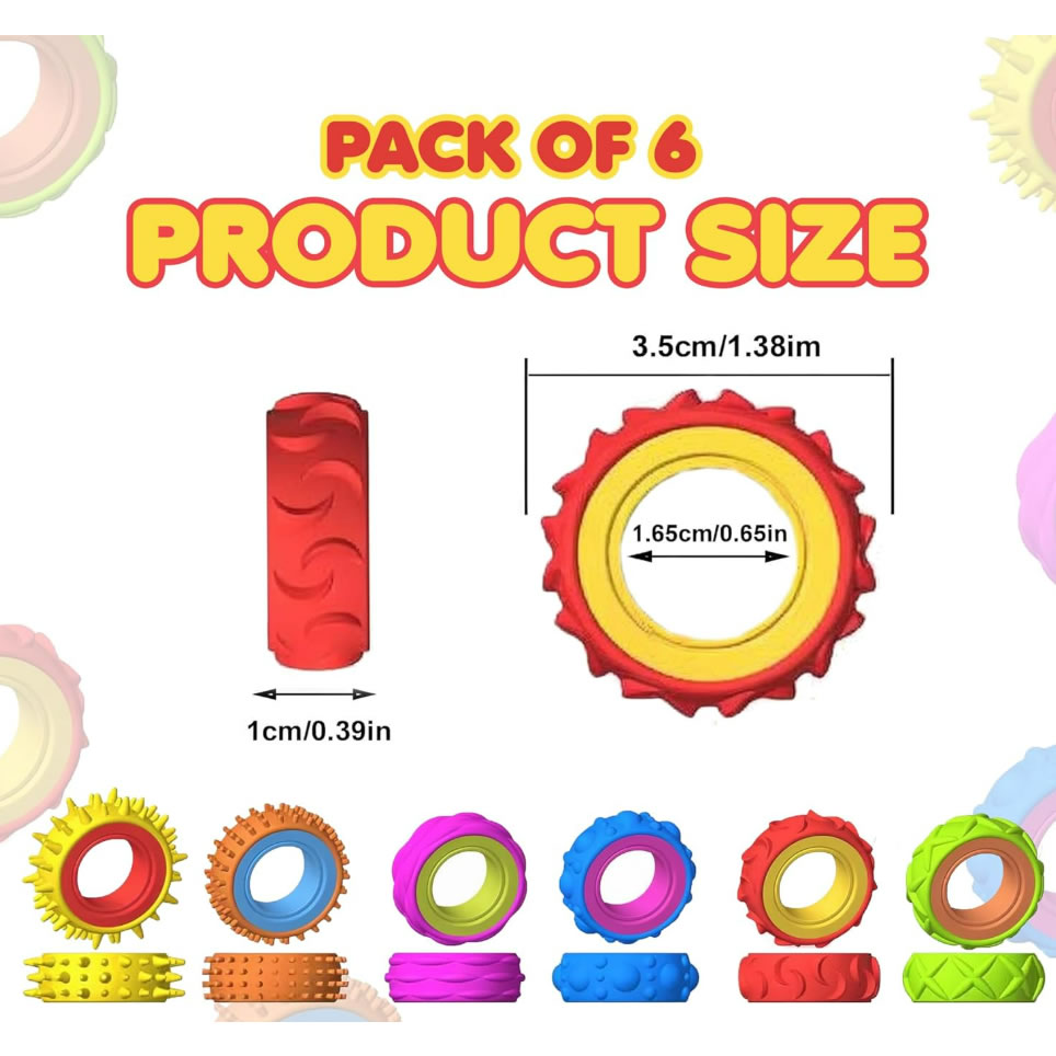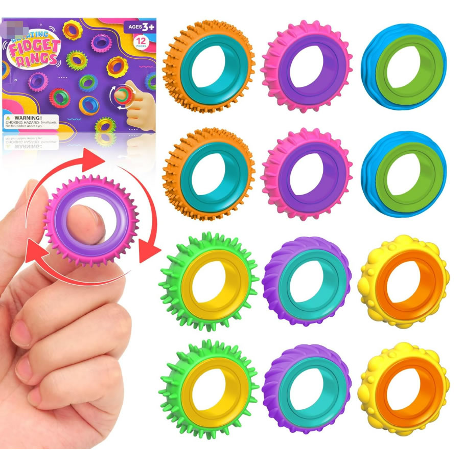 这款解压指环由一个塑料制成的滚动内环和一个硅胶制成的柔软外环组成。将这些小巧的解压玩具放入手指中,有助于缓解忙碌的手部和大脑。这些手指环包裹着各种柔软纹理的感官调节环,够帮助放松神经、减轻压力,为患有自闭症、多动症的人提供丰富的旋转感官体验。除此之外,还能拆下表面的纹理环来拉伸和挤压。