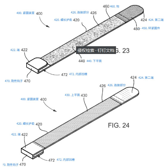 该专利的保护范围以四个独立的装置权利要求为主体,分别对应四种不同的紧固方式组合(全对称钩环、按扣+钩环、刚性钩+钩环、磁铁+钩环),也就是说这四种形式都侵权!其中采用全对称钩环设计的权利要求保护范围最宽。