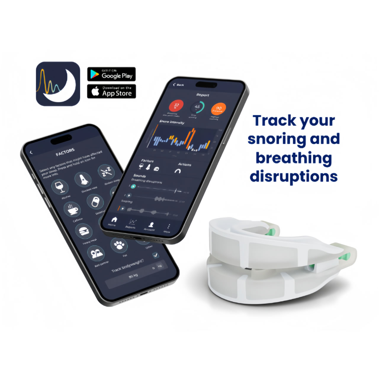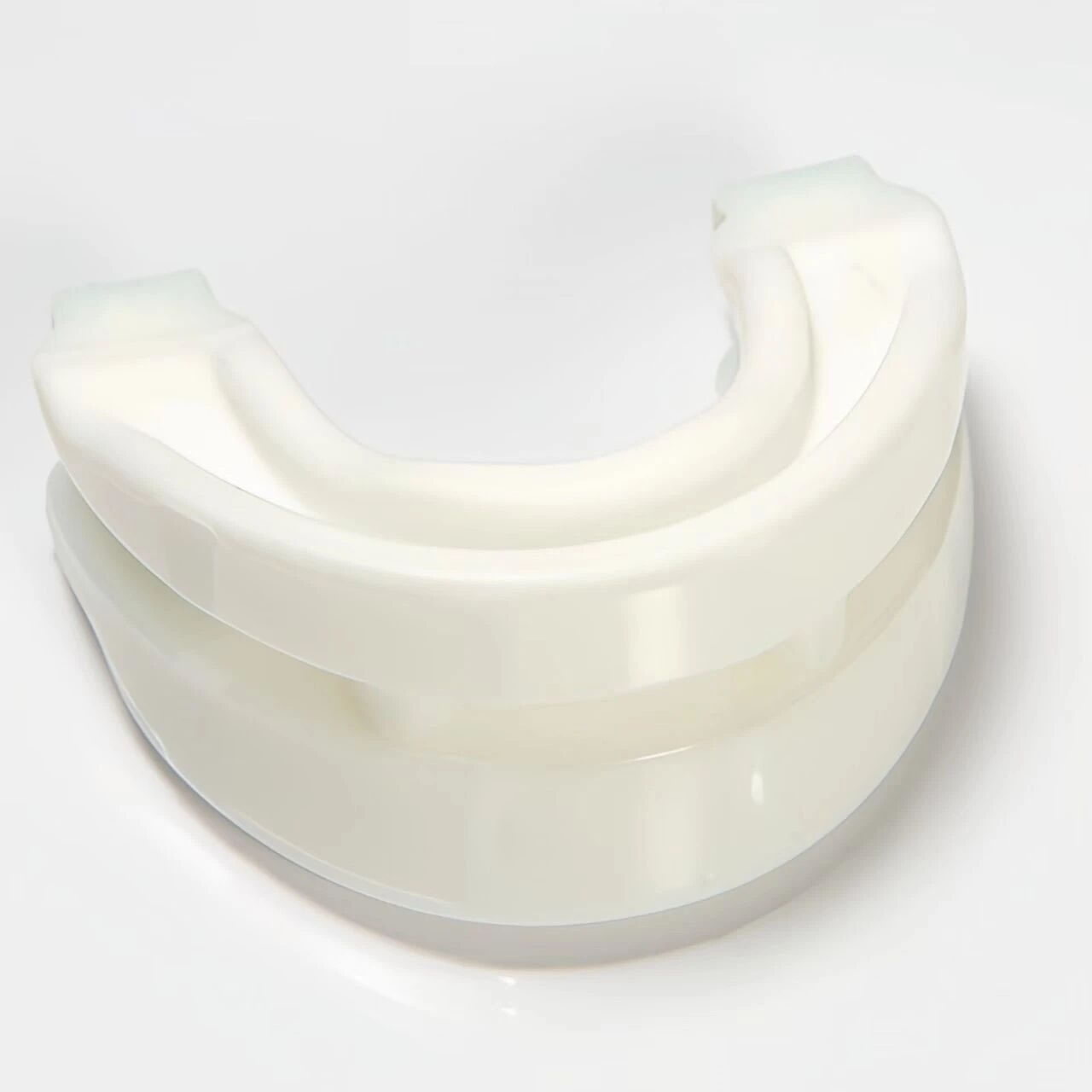 该口腔装置是一种抗打鼾吹嘴,用于治疗睡眠呼吸暂停和大声打鼾。它的工作原理是将下巴保持在正确的位置,以保持气道畅通。