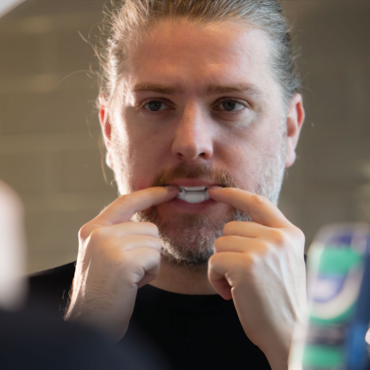 这是一种装置,其主体由一体式单件形成,具有用于接收佩戴者口腔上牙弓的第一托盘部分(16)和用于接收佩戴者口腔下牙弓的第二托盘部分(14)。